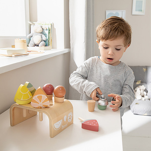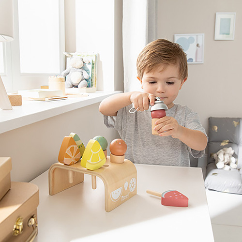 孩子們可以享受自己當冰淇淋店老闆賣冰淇淋,時尚又優雅的弧形設計冰淇淋架可以分別放3種甜筒冰淇淋和4種冰棒,舒服柔軟的配色看著就有愜意好心情。